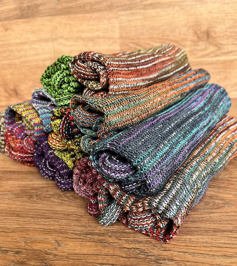 The ends of the dread band have a raw edge so it naturally rolls up a little at each end. This negates the need for uncomfortable seams which can be stretched out of shape. If the raw edge is exposed, gently stretching the headband out between your hands will encourage the edges to re roll. Some excess threads may shed initially and these can be pulled out if need be. This type of knit will not continue to fray. Gently wash by hand only (do not machine wash).